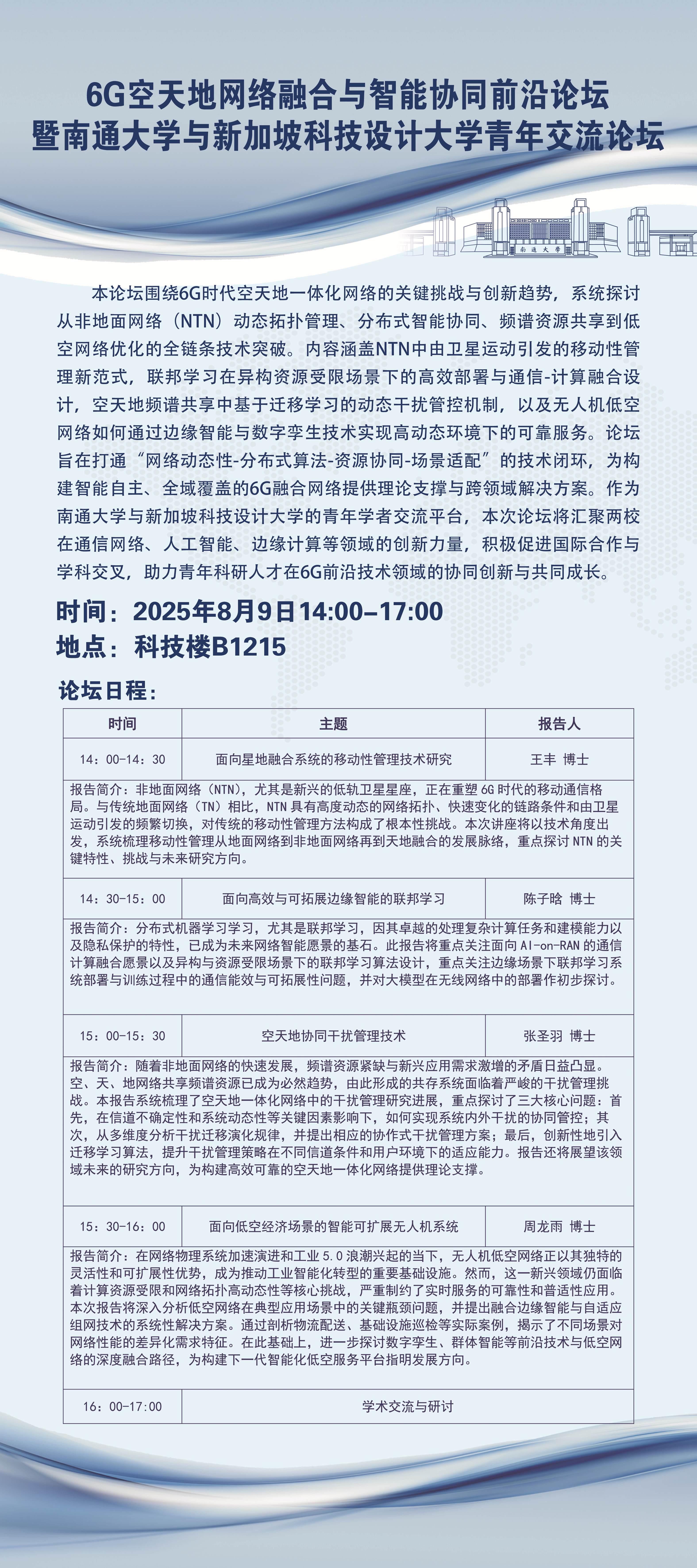 活动预告:6G空天地网络融合与智能协同前沿论坛暨南通大学与新加坡科技设计大学青年交流论坛