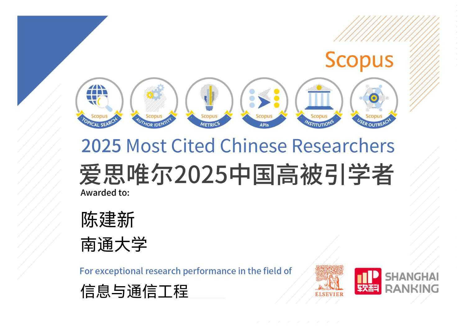 1月30日,国际知名学术出版机构爱思唯尔(Elsevier)发布2025年“中国高被引学者”(Highly Cited Chinese Researchers)榜单。色情小说 陈建新教授继2024年入选后,2025年再次成功入选,蝉联此项重要学术荣誉。